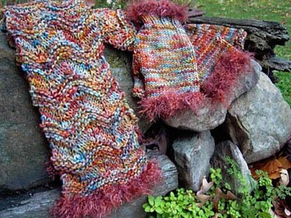 A fun scarf and mitts set to knit in DK yarn with or without trim. Knits up quickly and makes a great last-minute hand knitted gift.