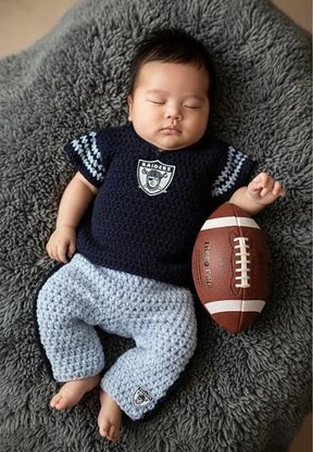 The Raiders football jersey and pants pattern is for any football enthusiast or raiders fan. Make it in an afternoon to take to your next baby shower. People will be awed by this super cute little outfit. Quick, easy and not much yarn. Pattern is written in US teminology.