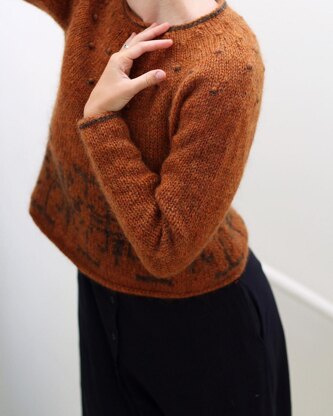 This pullover is a sort of Easter egg, a mystical totem of a gardener, who hopes for the rain and good harvest with the pattern of sun elements and rakes, which bring rain. Worked top down seamless in the round, this design features round yoke decorated with “rain drops” of wrapped knit stitches and a colourwork section on the bottom of the body.