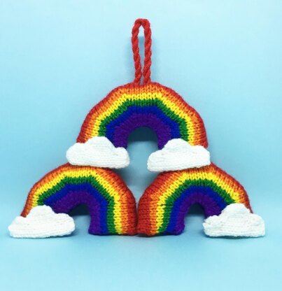 Here is a pattern for a rainbow and cloud mobile. An easy knit on 2.75mm single point (straight) needles -just increases and decreases. Several can be joined together to make it as dramatic as you like. Can be hung in the window, the nursery or even on a pram. The finished size for each rainbow is 12cm x 7cm tall and uses just a couple of grams of each colour yarn (5g of red, which includes the hanging loop).