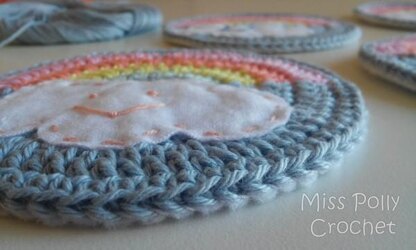 A fun and easy pattern to make four cute rainbow coasters, to brighten up any winter day! Ideal for using up oddments of yarn, as only small amounts in each colour are required. The coasters are made using mainly treble crochet stitches, worked in rounds with simple colour changes, finished with a felt cloud applique and backing.