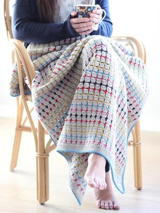 Rainbow dots blanket is 35 x 55 inches, using worsted weight yarn. Written in American English crochet terms.