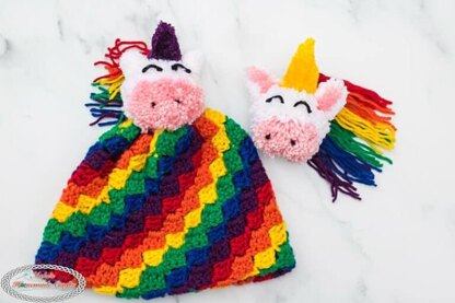 This unique rainbow hat is made using the Corner-to-Corner crochet technique and topped with a super cute unicorn pom pom