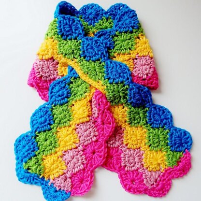 Make it as colourful as you like use five (5), four (4), three(3) or two (2) colours. Scarf is worked flat. Involves colour work; fan and shell stitch pattern. This written pattern has accompanying photographs at the end of the written instructions.