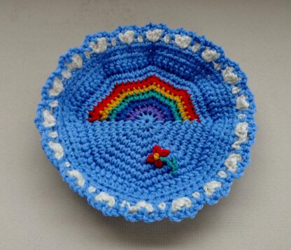 This whimsical rainbow motif small basket is attractive and very simple to make. It works up in a couple of hours or less, and measures about 5.5” in diameter across the bottom and about 1.75” high. Make some to give as gifts for Christmas, Hanukah, Birthdays, Easter, Purim, Mothers’ Day, Showers, and many other occasions.