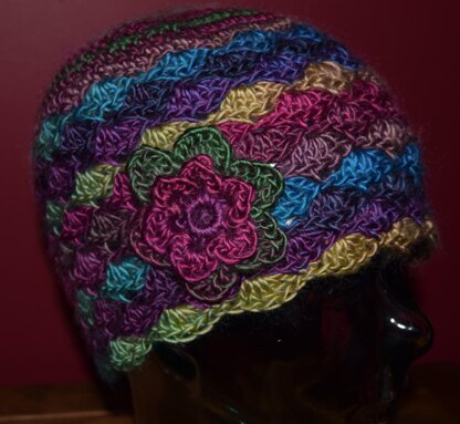 This soft cosy hat is made with Redheart Unforgettable yarn. The colours are bright and lustrous giving it a beautiful finish.