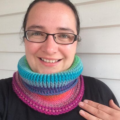 This cosy cowl acts as the perfect winter wind blocker. It is double-sided with a vertical texture on one side and a horizontal texture on the other. It can be rolled and folded to be worn in a variety of looks.