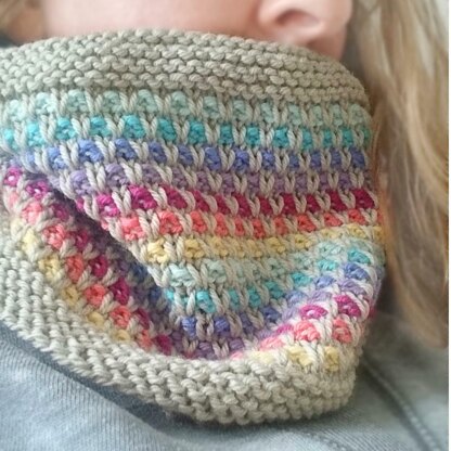 My Rainbow Slip cowl is worked in the round on circular needles. The pattern uses slipped stitches and colour changes are every two rows.