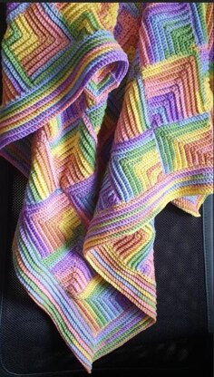 The Rainbow Textured blanket is made up of crocheted mitered squares, crocheted in stripes which are then sewn together to form blanket.