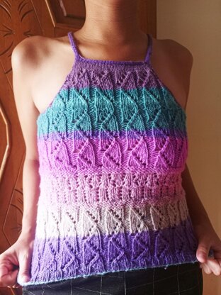 The Rainbow top is knitted from bottom to top. The bodice is knitted in the round using a diagonal buttonhole stitch, then the work is divided into sides 1 and 2, and each section is knitted back and forth using a diagonal buttonhole stitch with decreases on the sides. The straps are knitted with 4 stockinette stitches to the other end.