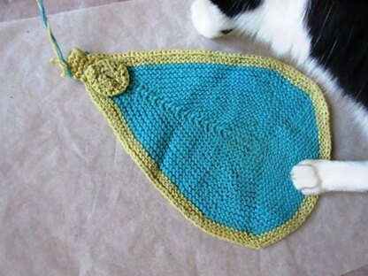 Raindrops Keep Falling on My Paws is a piece of 12 1/4" x 8 1/2" / 31.1 cm x 21.6 cm raindrop shaped hanging towel made with simple garter stitch. It comes with a knitted in raindrop shaped button and everything comes together in one piece with no add or cut. It is written in one (1) colour and one (1) string, and suitable with self stripe yarn.