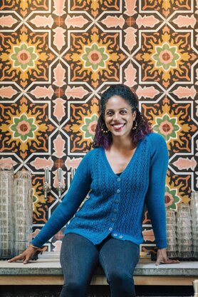 Rainy Lake is a polished yet cozy cardigan with a deep V-neck, all-over lace patterning, and long raglan sleeves. Simple 1x1 rib is used for the cuffs and buttonband. The back and fronts are worked flat in pieces, and the sleeves are worked in the round to the armholes.