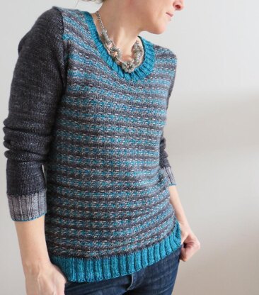 Raj-esque is worked from the top-down, in one piece and seamlessly. Starting at the shoulders, the back is knitted first to the underarm, followed by the fronts and the stitches are then joined in the round to knit the body. Stitches are picked up for the set-in sleeves and for the collar. The slipped stitch stripes are super easy and the effect is stunning with three colours!