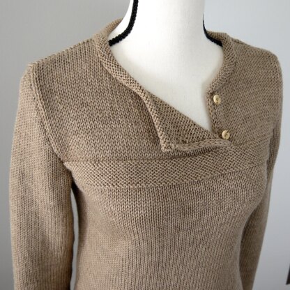 An asymmetrical collar and front detail in simple reverse stockinette texture combine for a casual look suitable for everyday wear. Sweater pieces are worked flat with set-in sleeve construction.