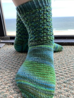 These socks feature a simple, easy to memorize lace pattern that rambles along the cuff.