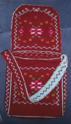 The bag is knitted all in one piece then the sides joined with slip-stitch crochet. The handle is knitted as part of the bag then joined using grafting. The finished bag is 35.5 × 31.5 cm (14 × 12.375 inches) not including the handle. The length including the handle is 80 cm (31.5 inches).