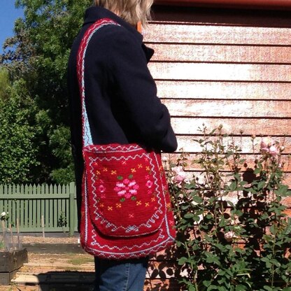 This colourful, double-knitted, self-lined shoulder bag is inspired by folk art. There’s plenty of scope here for different colour schemes and yarn types – with a bag like this, exact tension matching is not required. My version holds A4 pages and magazines.