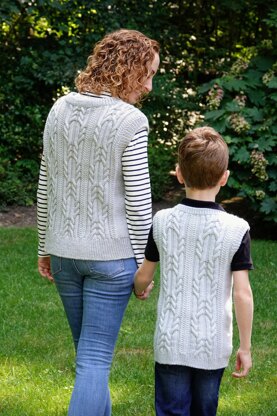 Boys and girls alike will love this super-soft cabled vest, a wardrobe essential that never goes out of style, is so easy to wear, and provides a cozy hug throughout the Autumn, Winter, and Spring. The body is knit in the round from the bottom up to the armholes. The front and back are each knit flat and then seamed at the shoulders. Stitches are picked up around each armhole and the neckband to work the armbands and neckband, respectively. The armbands and neckband also feature professional looking (and optional) tubular edges.