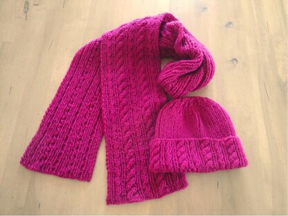 Cables twine along adding interest to this quick, chunky hat and scarf set.