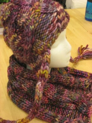 This quick knit aviator hat and neckwarmer will keep you warm and snuggly in brilliant Malabrigo colors.