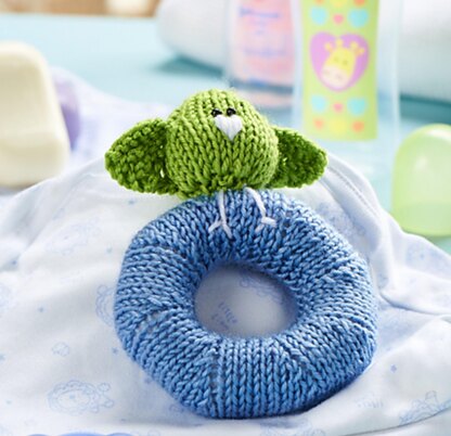 This Rattle Ring is a simple knit, it is knitted flat (not in the round) with increases and decreases to shape the ring. Perched on top of the ring is a little knitted bird. Designed by Amanda Berry @fluffandfuzz, the rattle is knitted in acrylic aran/medium weight yarns. The rattle is 16cm tall. For confident beginners and above, other techniques used include casting on and off, knits, purls, increases and decreases, and seaming to finish.