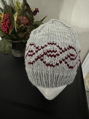 I was having some fun with some colorwork ideas recently, and this chain motif really caught my eye. It ended up looking like a band that you would find on fancy hats as a fastener, which I thought would be great for a beanie. The chain is such a fun detail.