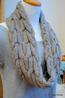 A trio of plush cables is worked flat then joined to form a loop. The pattern is written for a super bulky cowl or a short, bulky infinity scarf. The length can be adjusted for either yarn weight. Instructions for an optional, removable super bulky button tab are also included. The piece begins with a provisional cast-on and is completed by grafting the ends together.