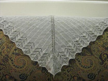 This shawl combines a pattern of stockinette, slipped stitches, lace and bobbles to add a sophisticated flair to a simple shawl. Instructions are in charted form. The pattern also includes recommendations for making the shawl larger.