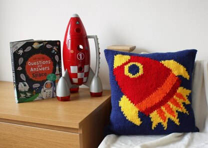 The cushion features a large intarsia rocket, is fastened with four buttons across the back and is designed to fit a 46 cm (18 inch) square cushion with a little negative ease to ensure a nice plump cushion.