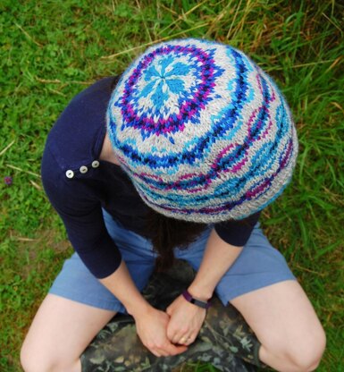 Pattern is charted only for the colourwork pattern on the rise of the hat. The crown decreases are both written out line by line and charted.