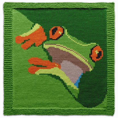Knit a burst of jungle color with this cheerful Red-Eyed Tree Frog Square Knitting Pattern! Featuring one of the jungle’s most iconic amphibians, this bright-eyed frog with vivid green limbs and playful orange toes brings a splash of tropical fun to any project. The design is worked flat with a neat garter stitch frame surrounding a smooth stockinette center — perfect for rainforest-themed baby blankets, kids’ pillows, wall panels, or even a bold sweater or tote bag. Finished size depends on yarn/needles: