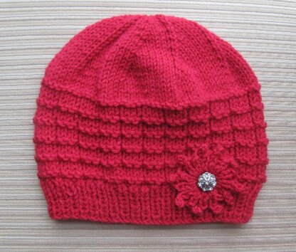 Red Hat in Waffle Stitch with a Knit Flower for a Lady