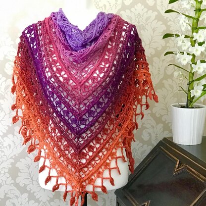 This is a beautifully textured top down triangle shawl. The fabulously rhythmic pattern is finished with an eye catching teardrop fringe, reminiscent of a host of vivacious red hot poker flowers on a warm sunny day.