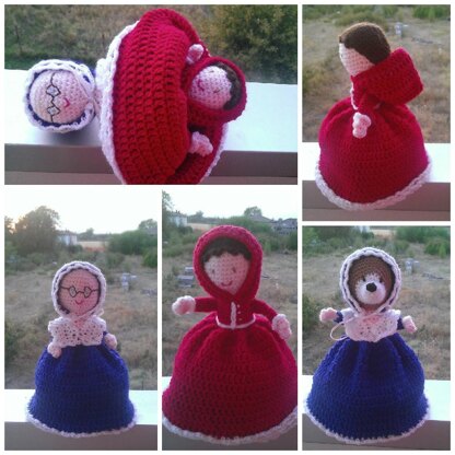 This is a lovely crochet doll pattern perfect for story telling! 3 dolls in one! Flip Red's skirt over to make the doll into granny, Swop the bonnet round and granny turns into the wolf!