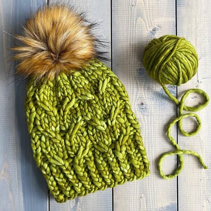 This ‘Reef Beanie’ uses a combination of slipped stitches and cable knitting to create a design that is very stretchy even with the thick yarn. The super bulky yarn makes for a very cozy and warm hat and a very quick knit as well.