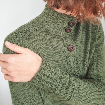 Regalia Cardigan is a funnel neck cardigan worked mostly in stockinette. Vertical and horizontal lines created using moss rib stitch, frame the silhouette and give the cardigan a special touch and a sophisticated look.
