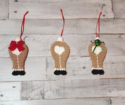 Ever wonder what Santa sees when he's riding on his sleigh? Reindeer butts! Crochet a few Reindeer Butt Ornaments for your Christmas tree this year. This crochet pattern works up quickly using just a few yards of worsted yarn, so it's a great stash buster. Crochet a few in different colors and adorn them with ribbons or bells. Also makes a great gift-wrapping adornment!