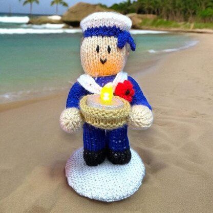 This gorgeous Remembrance Sailor knitting pattern is made to hold a battery operated tea light. It measures 20 cms tall from the base to the top of his hat.
