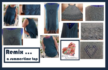 Pattern requires approx. 560-800 yards heavy fingering/light DK (sample shown used Berroco Remix Light in color #6984, a dark teal) using US#7 circs. Knit in the round from the top, you could easily increase or decrease the overall length of the top, knitting on the 7-inch border perpendicular to body of top once desired length is reached.
