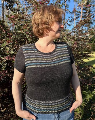 This top uses contrasting minis against a tonal in a simple design with a big result! This top is fine yarn at a larger than usual gauge so it’s lovely for spring through autumn. Use one color, a mini or gradient mini set, or leftover yarns on your stripes, stripe throughout or just as I have.