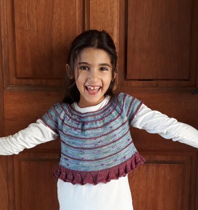 It is worked top down, seamlessly. Rounds in reverse stockinette st. and in a contrasting colour give some rythm to this little top. There is a frilled hem border too.