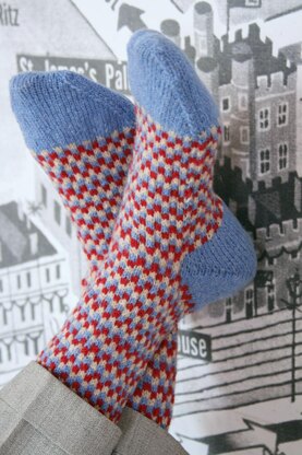 The Retro Jubilee socks were inspired by an early 1950s needlecraft book, when I came across this three-colour ‘Chequer board’ pattern being used as a cardigan trim. I decided that this would be the perfect pattern to use for these fabulous socks. They are knitted from the top down; the Hour-glass heel and co-ordinating toes are each worked in a single shade whilst the leg and foot of the sock is worked in the Chequer Stitch pattern throughout. Three lengths of leg have been provided but this can be easily adapted to suit your preference. The foot length is adjustable to fit your individual foot length too. The Chequer Stitch pattern is a very simple pattern of 2 stitches in each of two colours worked across the row with the two colours changing every 2 rows. The pattern is worked as stranded colourwork, carrying both colours across at the back of the work. The instructions for the Chequer Stitch pattern are provided both as a chart and as written instructions.