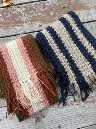 I designed this scarf because I liked the retro look of the colors in a long striped motif. Scarves have always been hard for me to make because it took so long to knit the shorter rows to make up a traditional scarf. This scarf is knit sideways, starting in the middle and working out on both sides.