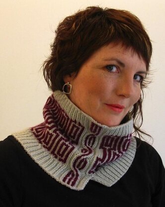 *"Inspired by the opulence of the Art Deco era, mashed together with a geometric pattern reminiscent of wallpapers from the 1960s and 70s. Contrasting garter stitches in the wave cable cascading down the full height of the cowl like strings of beads, think of those flapper beads worn in the 20’s whilst bopping to the Charleston."