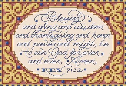 Designed by: Sandy Orton. The ornate border of this powerful verse from Revelation 7:12 is a formal and suitable adaptation of this scripture of thanksgiving. This design will inspire and be a lovely addition to any home.\n