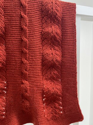 This chunky, snuggly baby blanket features contrasting columns of textured lace, cables and garter stitch, giving it a deep, sculptural texture. The blanket is reversible, alleviating the need to keep one side on show.