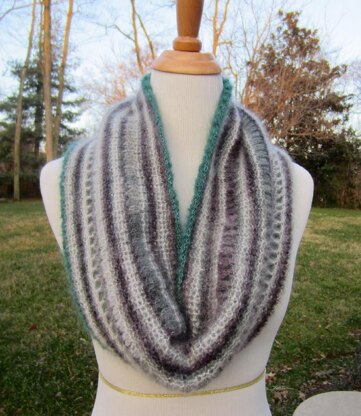 Reversible Mohair Cowl is worked in a striping mohair/silk blend and in a solid mohair/silk blend. It is worked in the round, and each side is worked in entirely different stitch patterns. It is finished by folding the piece and joining it along one edge. The double thickness insures that it is a very warm cowl.