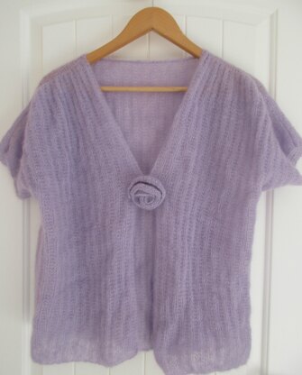 This is a pattern for a rib and flower shrug, originally published in Knitting magazine. It is a simple rib stitch, made in three pieces, with a knitted flower sewn onto the front.