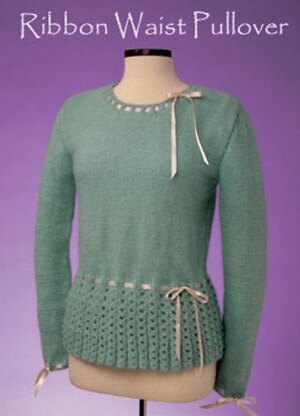 This beautiful sweater is a great addition to your work or dress-up wardrobe, but why not wear it with jeans as well. The bows are optional, and the sweater is lovely with or without them. Or leave the ribbon out altogether – the eyelets make a lovely trim at the cuffs and neck. There are instructions for shortening or lengthening the waist to better fit your shape.