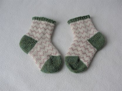 Sweet little color work sock pattern for baby boys and girls. Seamless styled toes and heels. Quick and easy little accessory to coordinate with unisex outfits. A fun and useful way to use up small bits of yarn.